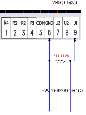 The output pins of VDO freshwater sensor must be connected in parallel with a resistor (R=100 Ohm or R=500 Ohm), see attached picture. The resistor has to be connected in parallel to one voltage input on shunts (SC303, SC503, ...) or ST107 SCQ25T.